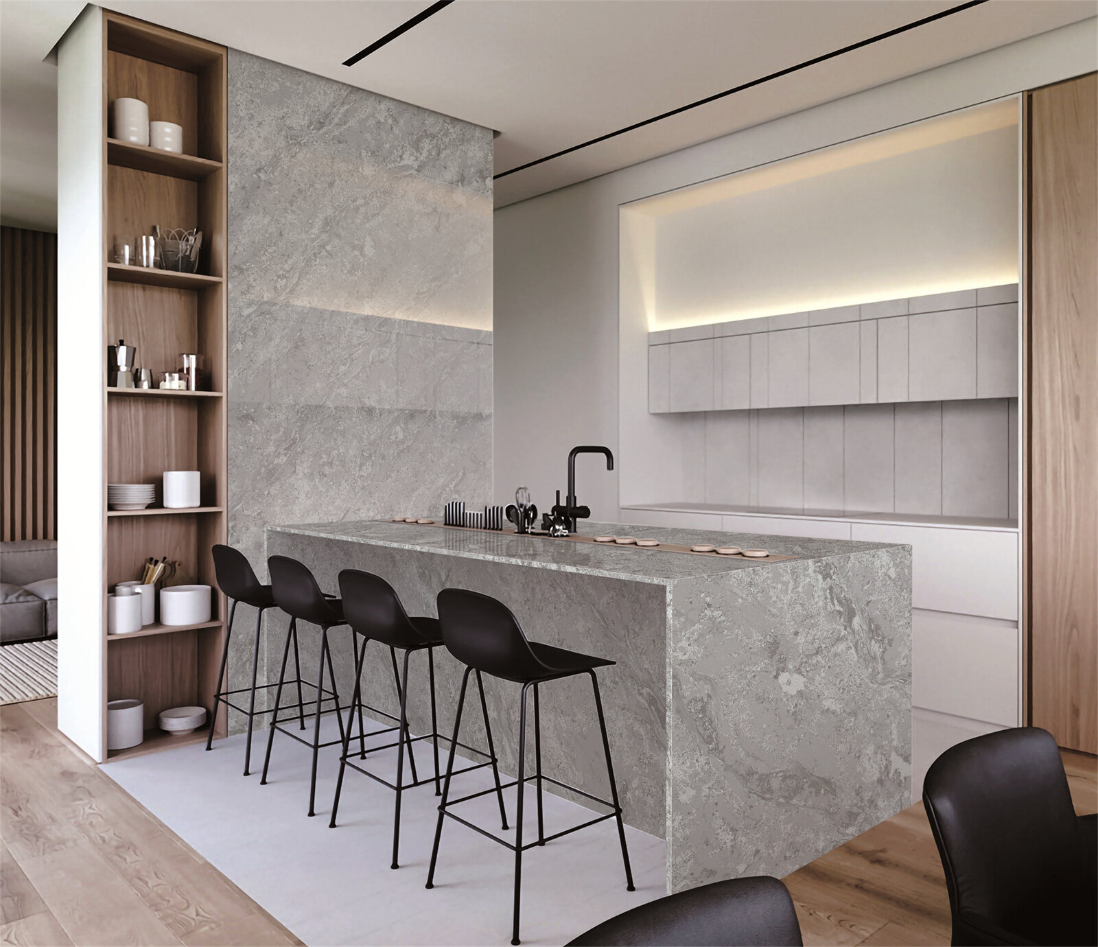 In the kitchen, Babylon Gray Concrete Quartz offers a durable and stylish surface for food preparation and dining. Its non-porous nature ensures that it remains hygienic and easy to clean, making it an ideal choice for busy kitchens. The neutral gray tones of the quartz complement a variety of cabinetry and appliance finishes, creating a cohesive and modern look.